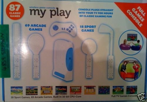 Have hours of fun with the my play Wireless Games Console. This compact gaming console contains plenty of classic sports and arcade games (87 in total). The ganes are low graphic and in a classic 16 & 8 bit pixelated format. The console is controlled by two wireless remotes with attachments for the different sporting games. Ideal for taking on holiday. Choice of mains or battery power.WHATS IN THE BOX:1 X CONSOLE2 X WIRELESS REMOTES1 X WIRELESS JOYPAD1 X 18 INTERACTIVE GAMES CARTRIDGE1 X 69 CLASSIC GAMES CARTRIDGE2 X PING PONG BAT ATTACHMENTS1 X TENNIS RACQUET ATTACHMENT1 X BASEBALL BAT ATTACHMENT1 X GOLF CLUB ATTACHMENT1 X TV ATTACHMENT CABLE1 X AV CABLE1 X AC ADAPTOR